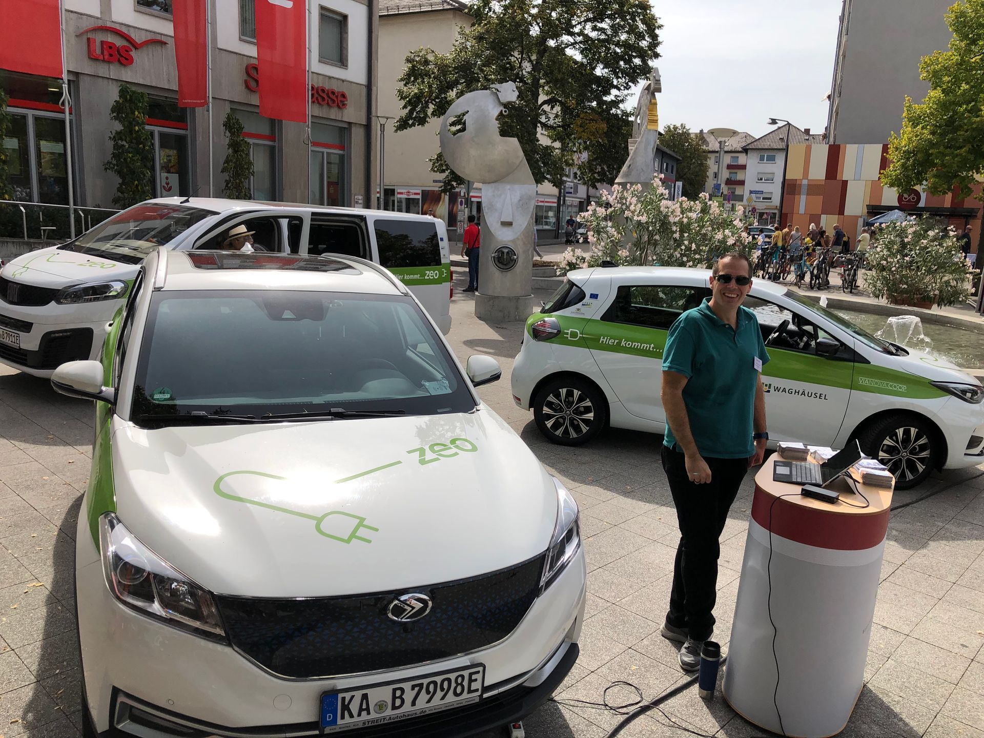 Auf dem Herbstfest in Bruchsal am 17.09.23 konnten wir einen Teil der neuen zeo-Flotte präsentieren. Mit dabei waren der Fiat E-Ulysse (9-Sitzer-Kleinbus) der Umwelt- und Energieagentur, der neue Renault Zoe (Kompaktwagen) von Waghäusel und der DFSK Seres (SUV) der Volksbank Bruchsal Kraichgau e.G.                                            Rund um zeo Carsharing gab es viele nette Gespräche mit Interessenten. Da eine Frage besonders häufig gestellt wurde: zeo Carsharing berechnet nur die gefahrenen Stunden und Kilometer. Es gibt keine zusätzlichen Gebühren!                                                                    Wir bedanken uns herzlich bei den drei genannten Fahrzeugstellern für die Bereitstellung ihres Fahrzeugs.